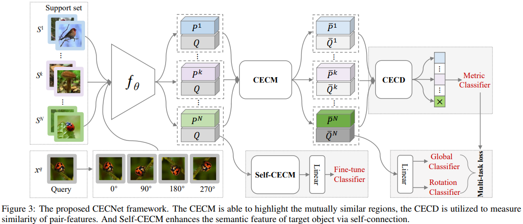 在基础训练阶段中,CECNet使用了旋转数据增强,并将支持集和旋转后的查询实例通过嵌入函数处理为原型特征和查询特征,然后每对特征都通过CECM进行处理,以增强相互相似的区域并生成更具有区分度的特征用于后续的分类。最后,CECNet通过多任务损失进行优化,包括度量分类器和辅助任务。