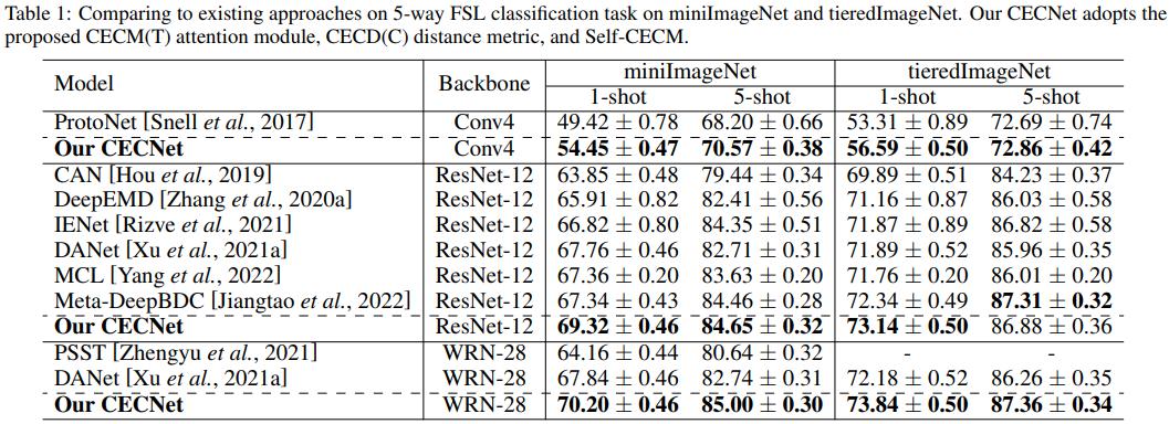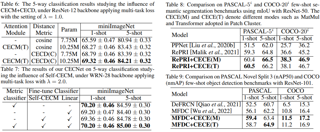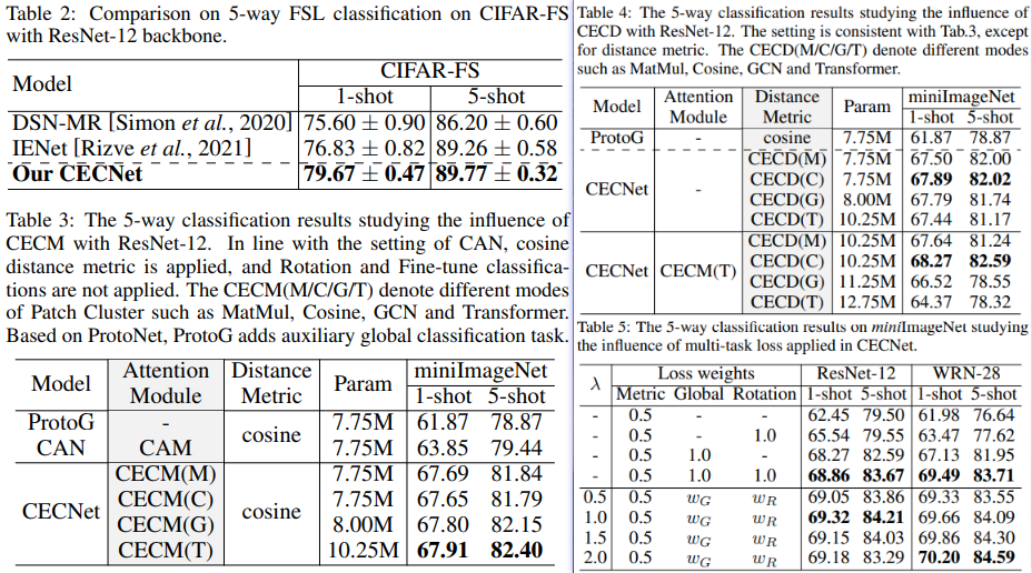 本文通过引入 Clustered-patch Element Connection 层提出了一种新的 few-shot classification 模型 CECNet,从上述结果可见,该模型在 miniImageNet、tieredImageNet 和 CIFAR-FS 数据集上取得了 SOTA 表现。与现有的度量学习方法相比,CECNet 利用 CECM 和 Self-CECM 模块增强了对象间的语义关联,并获得了更具辨别性的表示。在 WRN-28 backbone 下,CECNet 的精度提高了 2.36%,超过了 DANet。