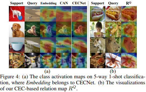 图4(a)展示了 CECNet 和 CAN 的类激活图对比。通过将 CECNet 与其嵌入进行比较,它显示 CECNet 能够突出显示在预训练阶段看不见的目标对象。与 CAN 相比,本文方法更精确,具有更大的感受野。