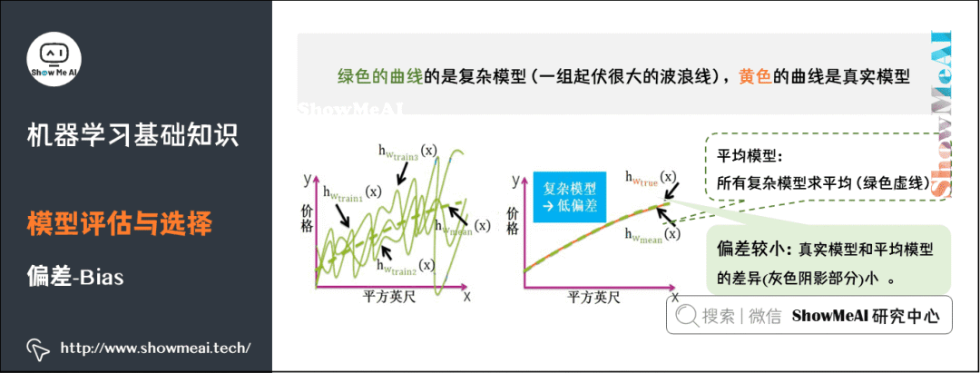 复杂模型是一组起伏很大波浪线,平均之后最大值和最小组都会相互抵消,和真实模型的曲线差别较小,因此复杂模型通常低偏差(见黄色曲线和绿色虚线几乎重合)。