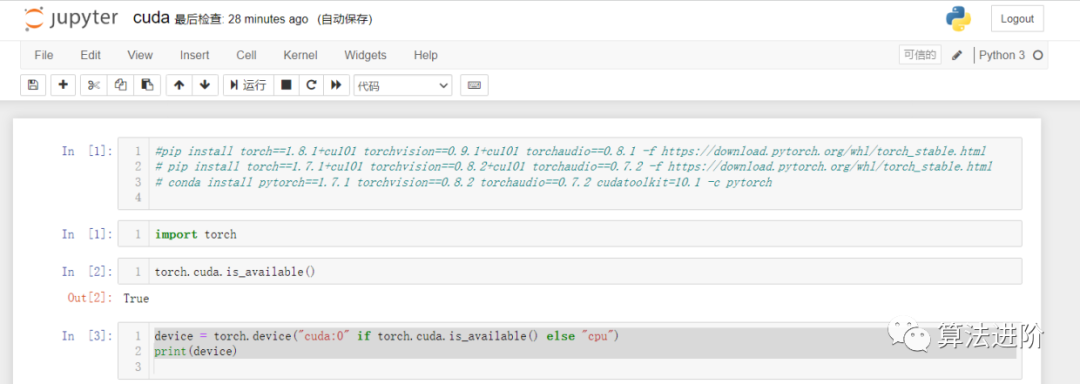 安装以后,可以检查GPU的可用性 ,通过调用torch.cuda.is_available()。如果结果为 True,则表明系统已正确安装Nvidia驱动。进入jupyter notebook运行:import torch torch.cuda.is_available()