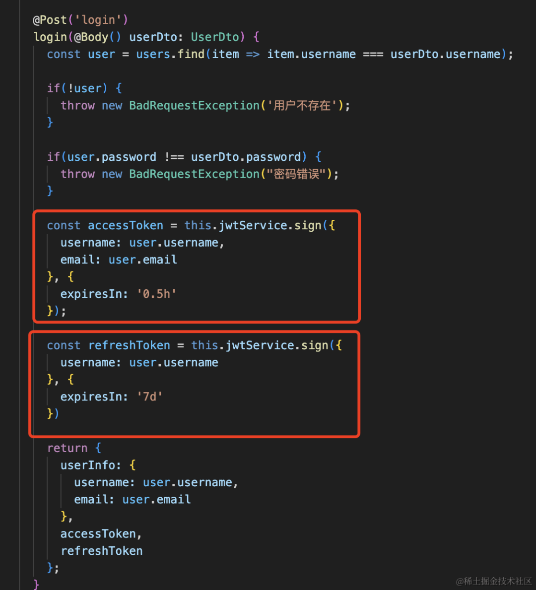 然后用这个 jwtService 生成 access_token 和 refresh_token: