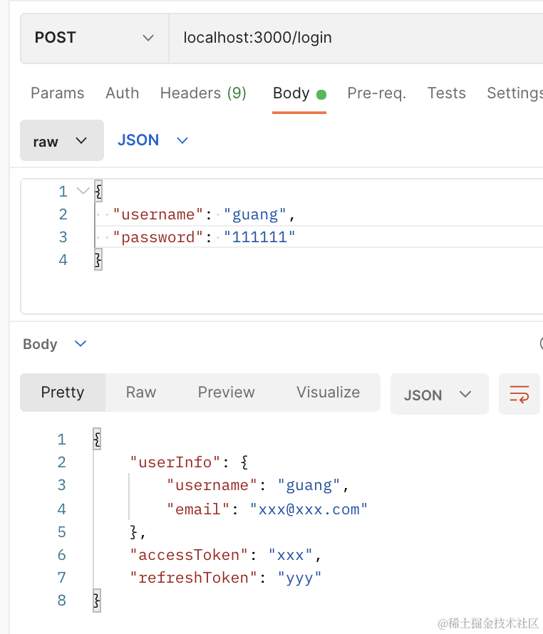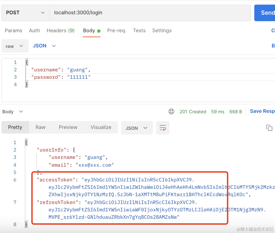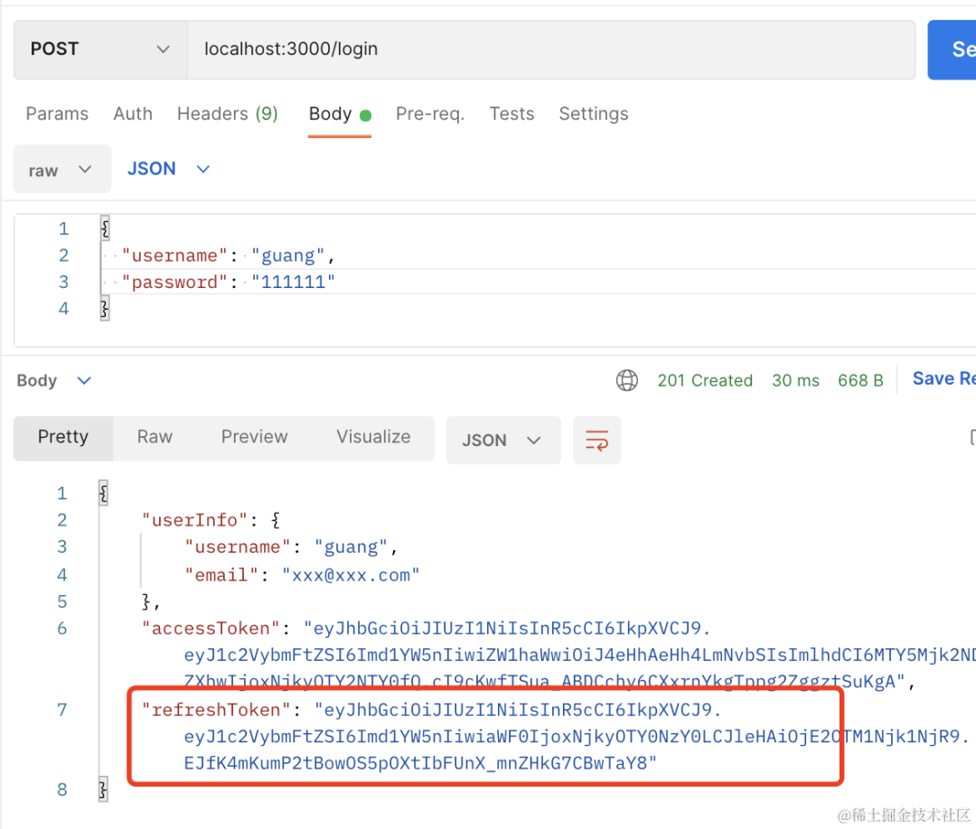 我们通过 nest 实现了这种双 token 机制,在 postman 里测试了一下。