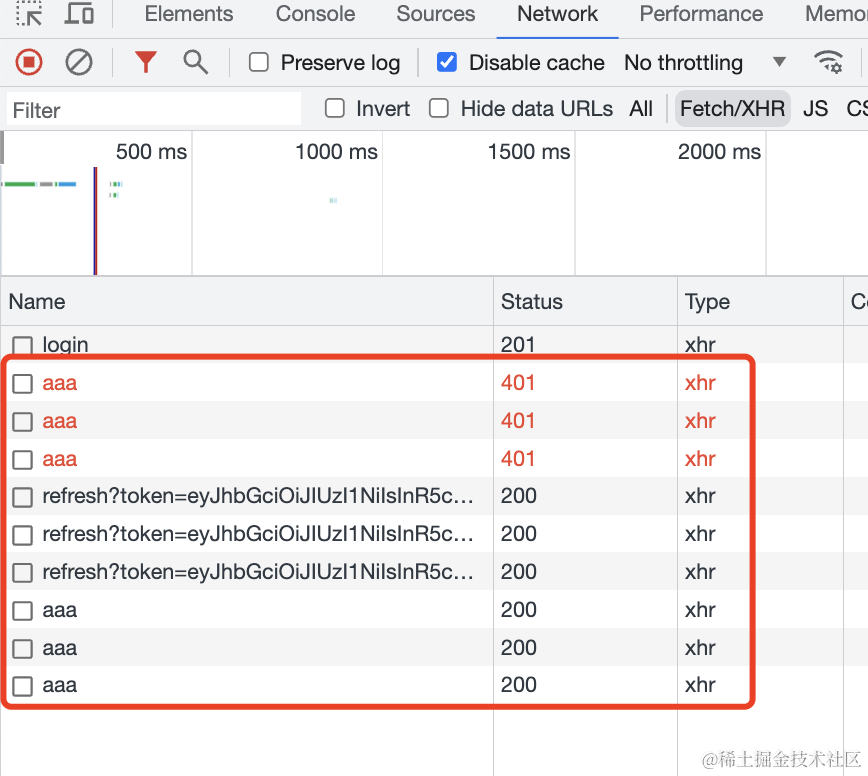 第一次访问 aaa 接口返回 401,自动调了 refresh 接口来刷新,之后又重新访问了 aaa 接口。
