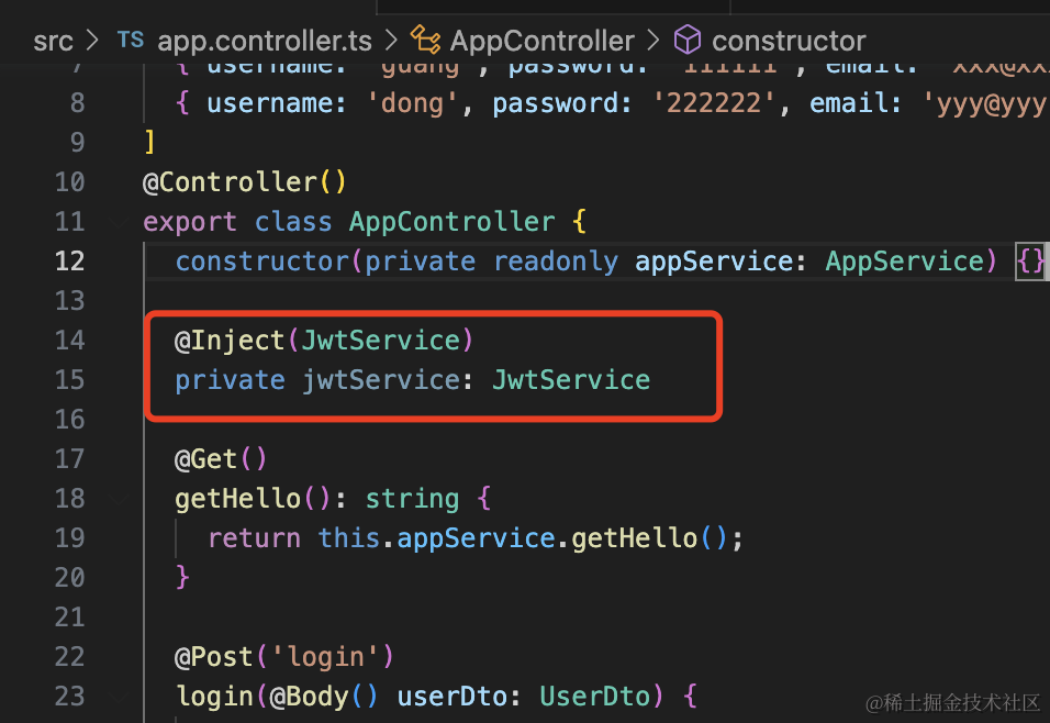 然后在 AppController 里就可以注入 JwtService 来用了: