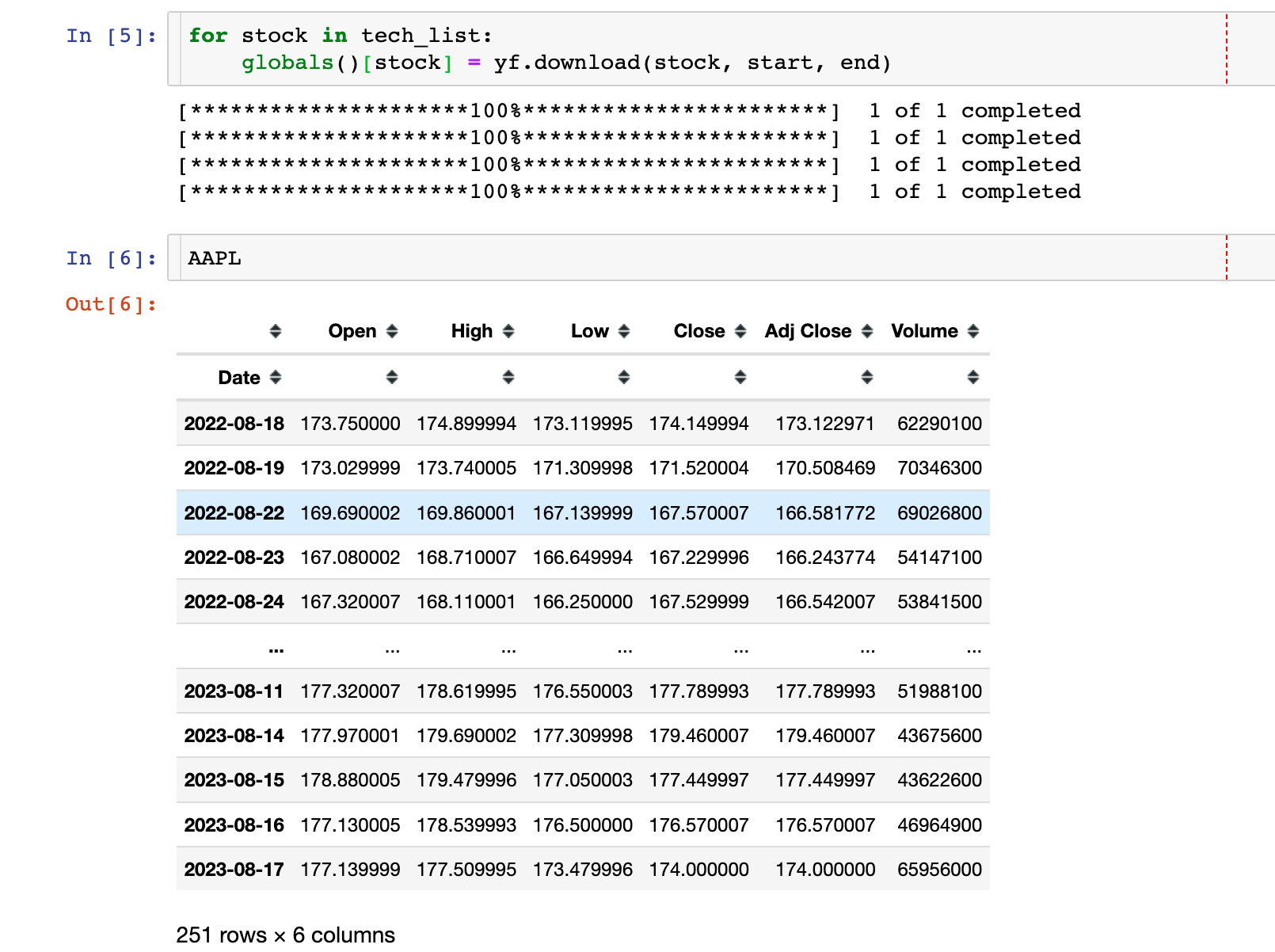 apple = yf.download(name, start='2022-01-01', end='2022-12-31')In 1: