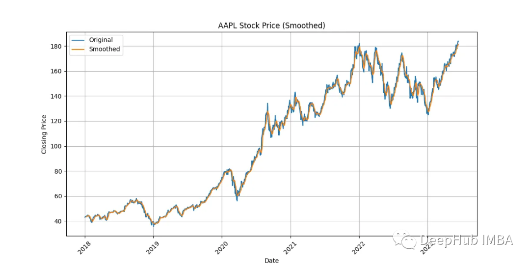 该图显示了原始收盘价和使用移动平均线获得的平滑版本。平滑有助于整体趋势的可视化和减少短期波动的影响。
