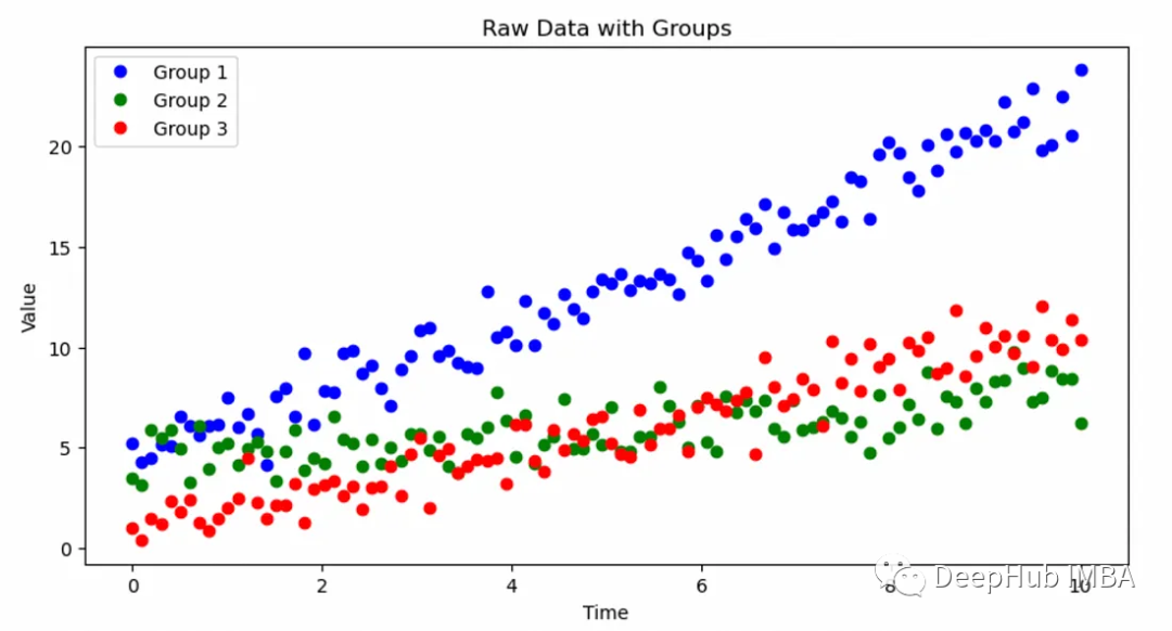 y = slope_true[group_indicator]*x + intercept_true[group_indicator] + np.random.normal(0, 1, size=n_groups*n_data_points)我们生成了三个不同组的时间序列数据。每组都有自己的时间趋势,由唯一的截距和斜率定义。