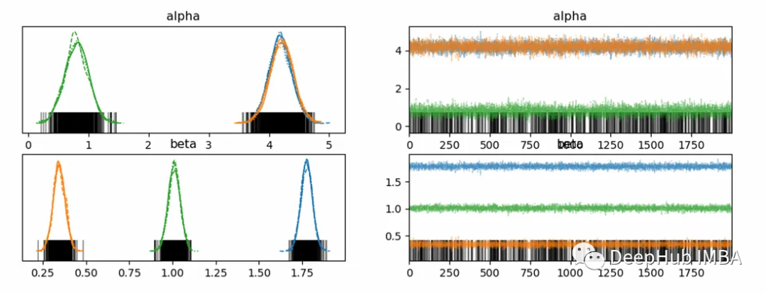 trace = pm.sample(2000, tune=1000)现在我们已经定义了模型并对其进行了采样。让我们检查不同参数的模型估计: