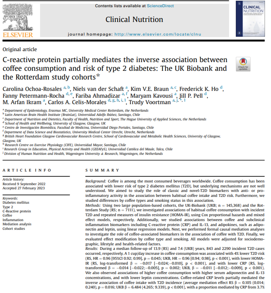 咖啡是全球消费最频繁的饮料之一,其潜在的健康效应引发了重要的科学研究。先前的研究已经将更高的咖啡摄入量与较低的T2D风险联系起来,但潜在机制仍不清楚。