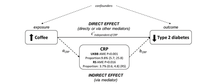 在中位随访时间为13.9(RS)和7.4(UKB)年期间,分别发生了843和2290例新发T2D病例。每天多喝一杯咖啡与T2D风险降低4%相关联(RS,HR = 0.96 [95% CI 0.92;0.99],p = 0.045;UKB,HR = 0.96 [0.94;0.98],p < 0.001),与更低的HOMA-IR(RS,对数变换β = −0.017 [−0.024;−0.010],p < 0.001),以及更低的CRP(RS,对数变换β = −0.014 [−0.022;−0.005],p = 0.002;UKB,β = −0.011 [−0.012;−0.009],p < 0.001)相关。我们还观察到更高的咖啡摄入量与更高的血清脂连蛋白和IL-13浓度以及更低的瘦素浓度相关。咖啡相关的CRP水平在一定程度上介导了咖啡摄入与T2D发病的负相关性(RS β = 0.105(0.014;0.240),p = 0.016;UKB β = 6.484(4.265;9.339),p < 0.001)。其他生物标志物没有观察到中介效应(mediation effect)。饮用滤(过滤或意式)咖啡以及从不吸烟和戒烟者中咖啡-T2D和咖啡-CRP表现出更强的相关性。