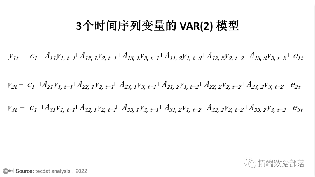 众所周知,向量自回归模型处理的是多元时间序列,这意味着会有两个或多个变量相互影响。因此,向量自回归 模型方程随着时间序列中变量数量的增加而增加。