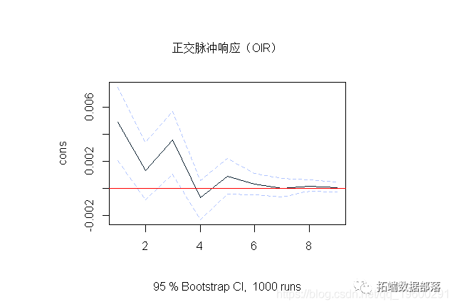 一旦我们确定了最终的VAR模型,就必须解释其估计的参数值。由于VAR模型中的所有变量都相互依赖,因此单个参数值仅提供 有限信息。为了更好地了解模型的动态行为,使用了脉冲响应(IR)。可以绘制因变量的轨迹,产生在许多宏观论文中都可以找到的那些波浪曲线。