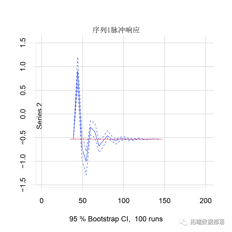 在下面的示例中,我们想知道受到冲击后序列2的行为。指定了我们想要脉冲响应的模型和变量后,我们将时间范围设置n.ahead为20。该图给出了序列2的响应。