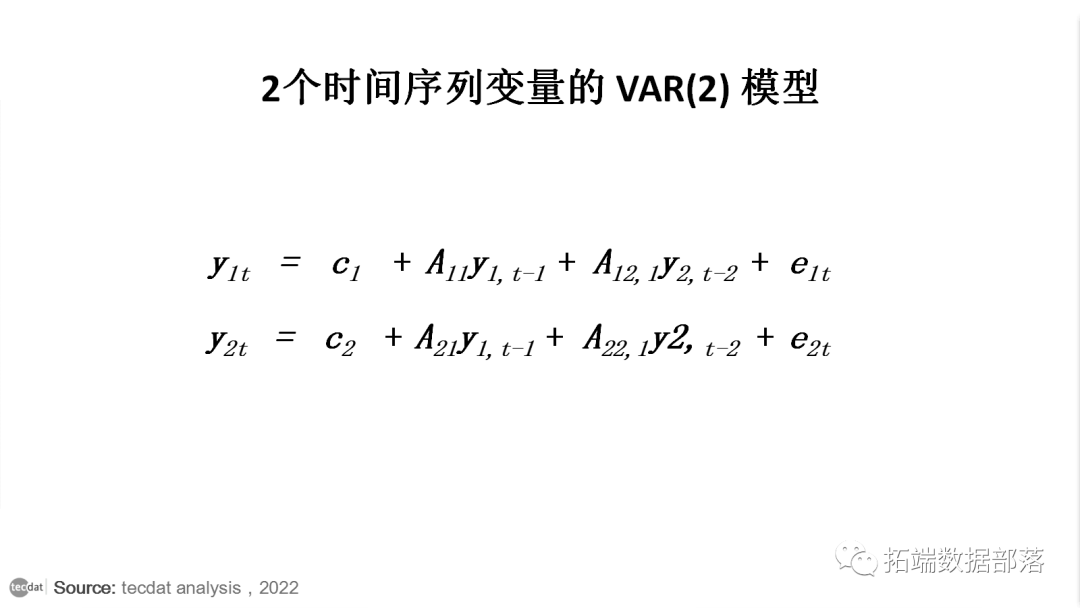 假设有两个时间序列变量 y1 和 y2,因此要计算 y1(t),向量自回归 模型将使用两个时间序列变量的滞后。