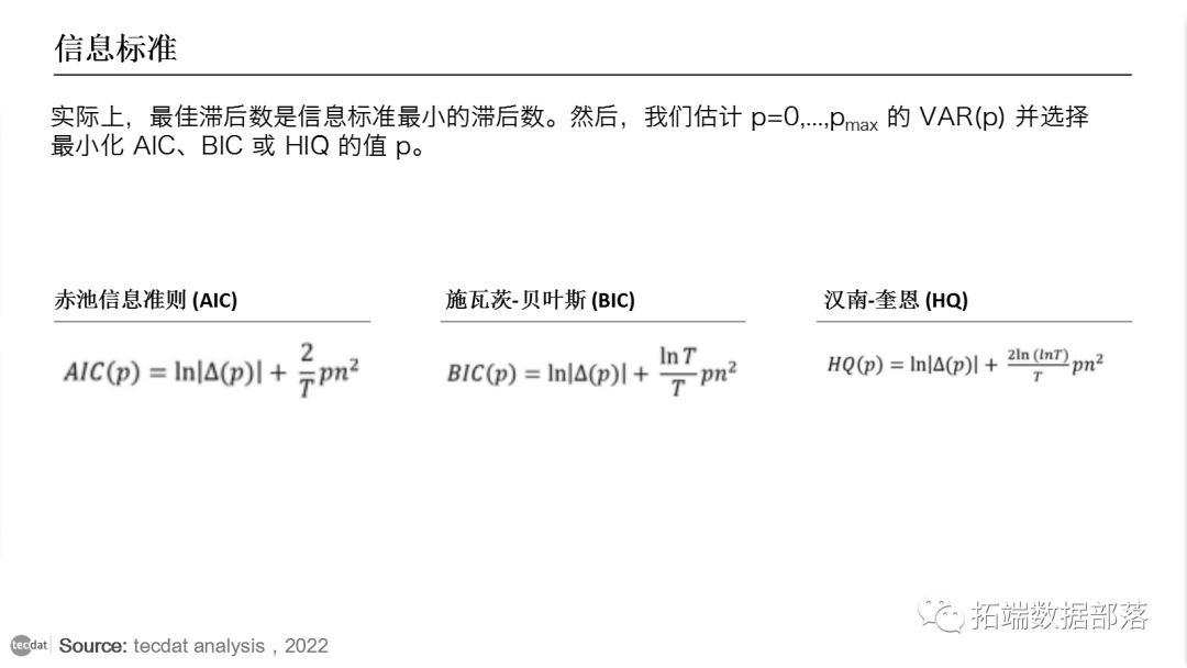 信息标准 (IC) 用于确定最佳滞后长度。最常用的是 Akaike IC、Hannah-Quinn 准则和 Schwarz 准则。