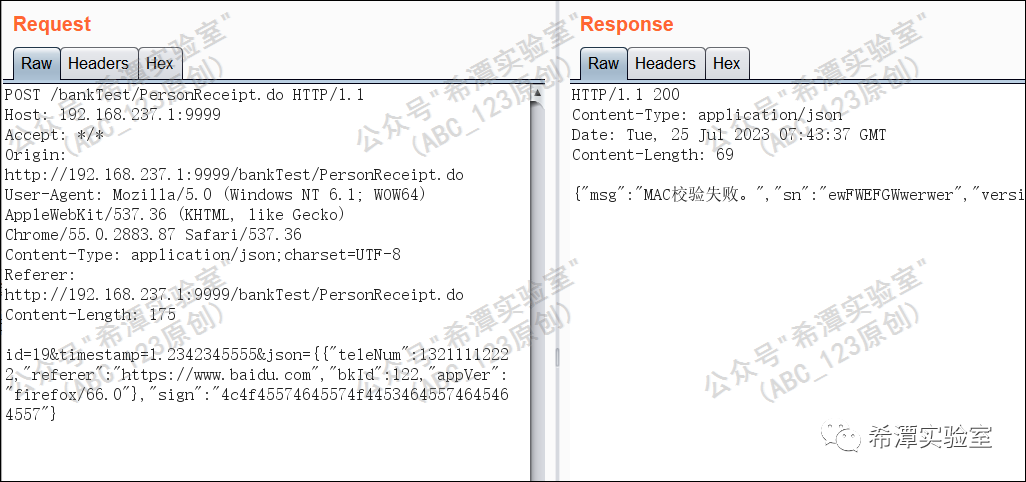 有时候会遇到如下这种情况,使用burpsuite抓包后,重放数据包会提示MAC校验失败,这种情况比较难办,在本次案例中,尝试删除sign字段,就不会提示“MAC校验失败”了。