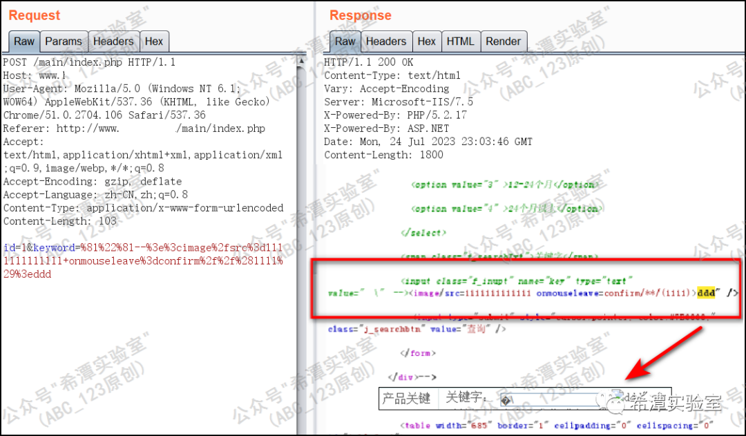 这里无论怎么操作,xxs的payload都会落在双引号内被当作字符串而无法执行,这时候可以尝试用宽字节方法,吃掉临近的转义字符反斜杠,从而继续XSS。如下图的箭头所示,图片裂开显示,说明xss代码得到了解析执行。