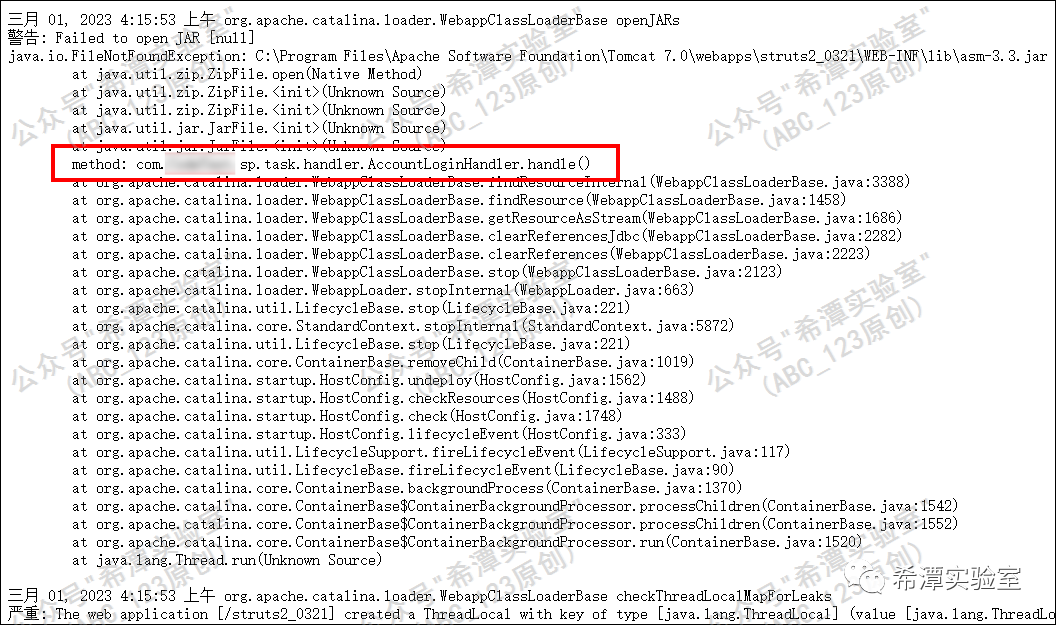 首先通过扫目录,发现一个/logs路径,里面有一些Web应用程序的报错信息,从中发现了一个不常见的jar包类名。
