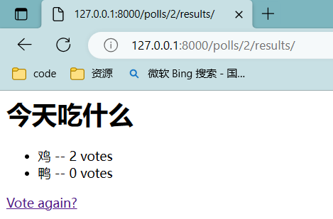 <a href="{% url 'polls:detail' question.id %}">Vote again?</a>现在,在你的浏览器中访问/polls/1/然后为 Question 投票。你应该看到一个投票结果页面,并且在你每次投票之后都会更新。如果你提交时没有选择任何 Choice,你应该看到错误信息。