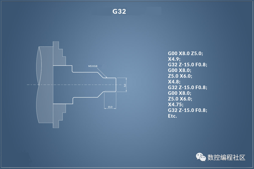 在这里,我们告诉机床将主轴旋转锁定到进给速率,以便我们每次都可以在同一位置切削螺纹。从现在开始,每次调用 G32 时,机器都会按照与前一次相同的路径切削螺纹。Z 距离是螺纹末端,F 是螺距。我们正在切削 M5的螺纹,螺距为 0.8 毫米。