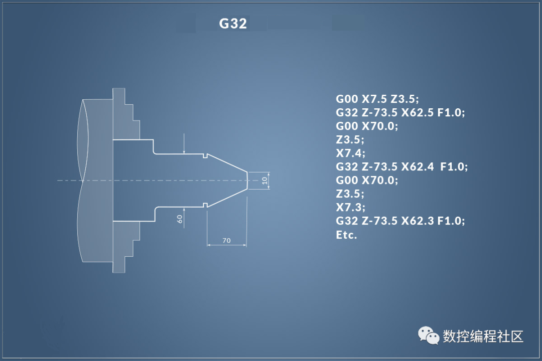 在我们讨论切削锥形螺纹之前,我们先来看看 G32 如何车削标准螺纹的。这是使用 G32 代码的程序部分。