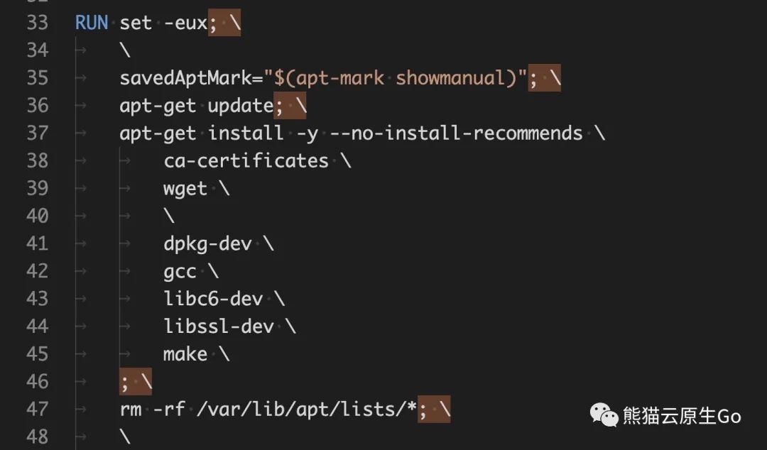 可以看到, RUN 内容虽然没有通过 && 链接, 但是都是使用 ; 和 \ 进行 分段,换行 管理的, 还是有一定不便。