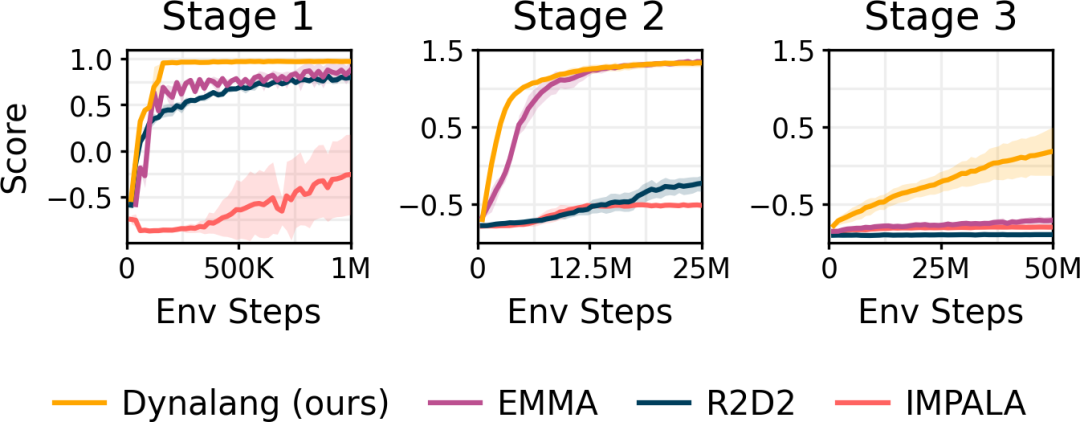 研究者在 Messenger 游戏环境中进行评估,以测试智能体如何从更长、更复杂的文本中学习,这需要对文本和视觉观察进行多次推理。智能体必须对描述每个任务动态的文本手册进行推理,并将其与环境中实体的观察结果结合起来,以确定哪些实体应该接收消息,哪些应该避免。Dynalang 的表现优于 IMPALA、R2D2 以及使用专门架构对文本和观察进行推理的任务特定 EMMA 基线,特别是在最困难的第三阶段。