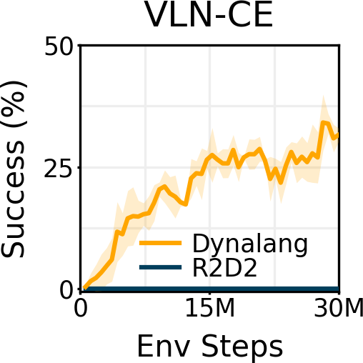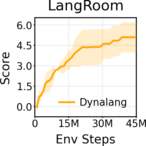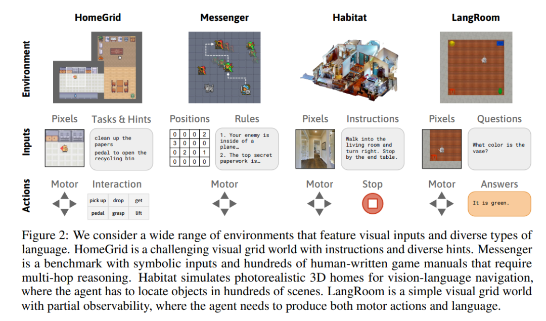 研究者考虑了一系列具有视觉输入和多样化语言的环境。HomeGrid 是一个具有指令和多样化提示的具有挑战性的视觉网格世界。Messenger 是一个具有符号输入的基准测试,包含数百个人工编写的游戏手册,需要进行多次推理。Habitat 是一个模拟逼真的 3D 家居环境,用于视觉 - 语言导航,在其中智能体必须在数百个场景中定位物体。LangRoom 是一个简单的视觉网格世界,具有部分可观察性,智能体需要同时生成动作和语言。