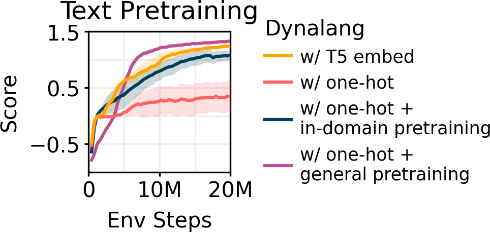 由于使用语言进行世界建模与基于世界模型的行动学习解耦,Dynalang 可以使用离线数据进行预训练,而无需行动或奖励标签。这种能力使得 Dynalang 能够从大规模的离线数据集中受益,全部都在单一的模型架构内实现。研究者使用仅包含文本数据的数据对 Dynalang 进行预训练,从零开始学习 token 嵌入。在通用文本数据(TinyStories,2M 个短故事)上预训练模型,提高了模型在 Messenger 上的下游强化学习任务表现,超过了使用预训练的 T5 嵌入的结果。
