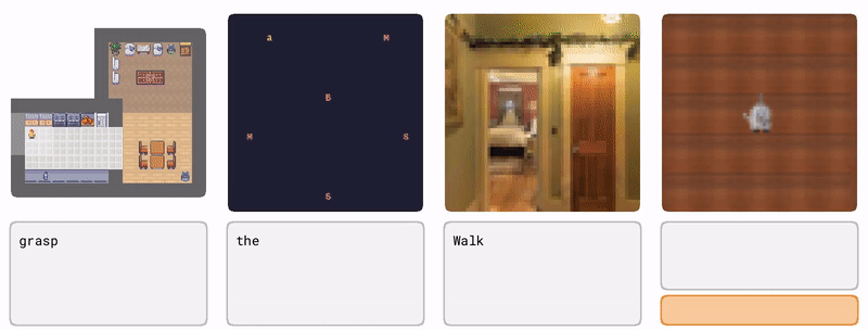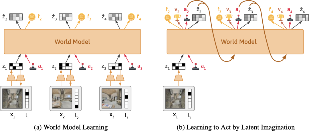 如下图(左)所示,在每个时间步,世界模型将文本和图像压缩成潜在表示。通过这个表示,模型被训练用于重建原始观察结果、预测奖励,并预测下一个时间步的表示。直观地说,世界模型根据它在文本中读到的内容,学习它应该期望在世界中看到什么。