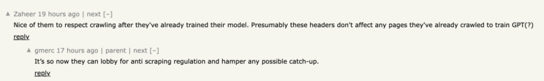「在训练完模型后还爬取数据,这真是太好了。根据推测,这些 header 不会影响他们已经抓取来训练 GPT 的任何页面。」