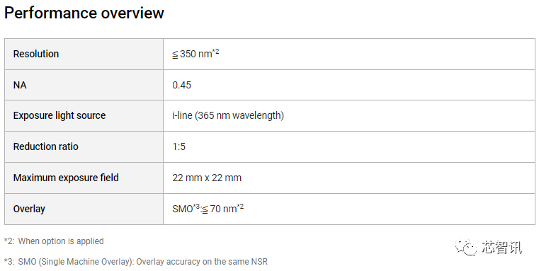 从官方公布的参数来看,NSR-2205iL1 曝光光源是 i-line(365nm波长),分辨率≤350nm,NA为 0.45,最大曝光场22 mm x 22 mm。