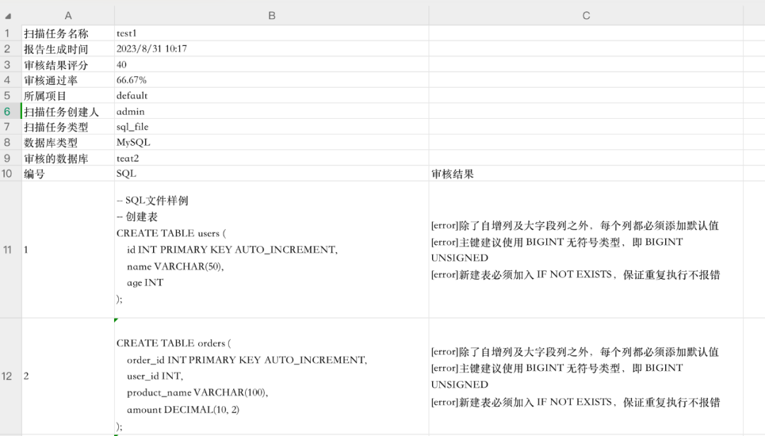 平台将以 CSV 格式导出当前扫描任务报告内容,用户可以在导出文件中查看报告基本信息及 SQL 审核结果。