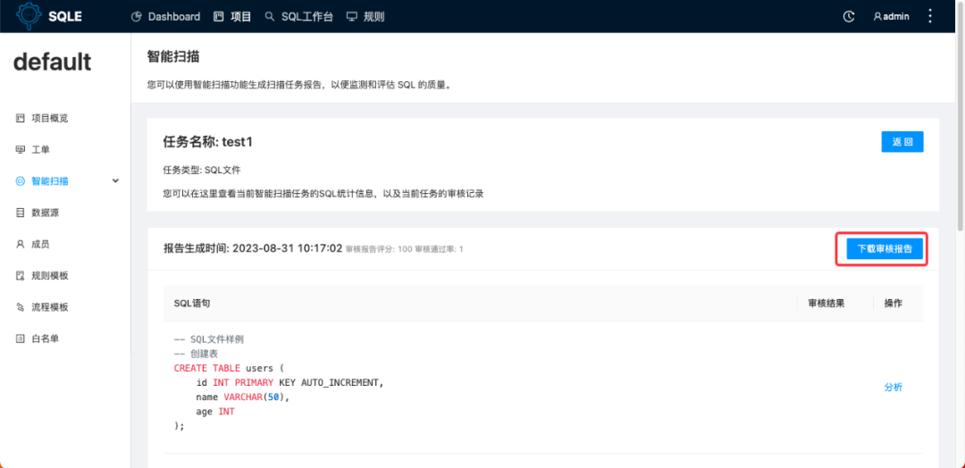 本期已实现扫描任务审核报告的下载功能。当用户需要将扫描任务产生的审核报告同步给项目外的其他人,或需要对审核报告进行存档时,可以直接下载报告文件。以下是简单的功能试用: