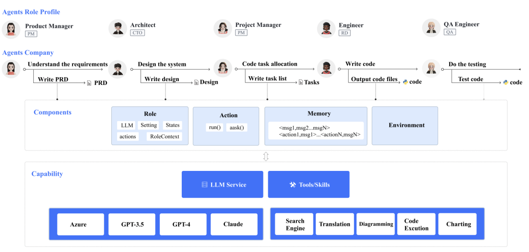 MetaGPT的方法展示了,将高层次任务分解为由不同角色,比如产品经理、架构师、项目经理、工程师,处理的详细可操作组件的能力。