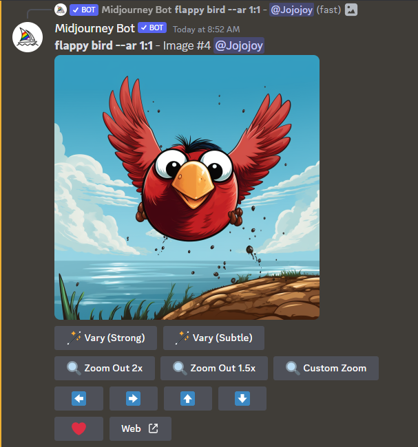 代码改完之后,再用Midjourney生成一只红色小鸟。