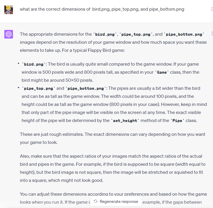 python startup.py "write p5.js code for Flappy Bird where you control a yellow bird continuously flying between a series of green pipes. The bird flaps every time you left click the mouse. If the bird falls to the ground or hits a pipe, you lose. This game goes on infinitely until you lose and you get points the further you go" --code_review True