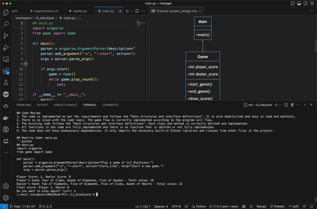 把自己的需求通过prompt的形式告诉系统后,就可以看着MetaGPT给你写代码了。