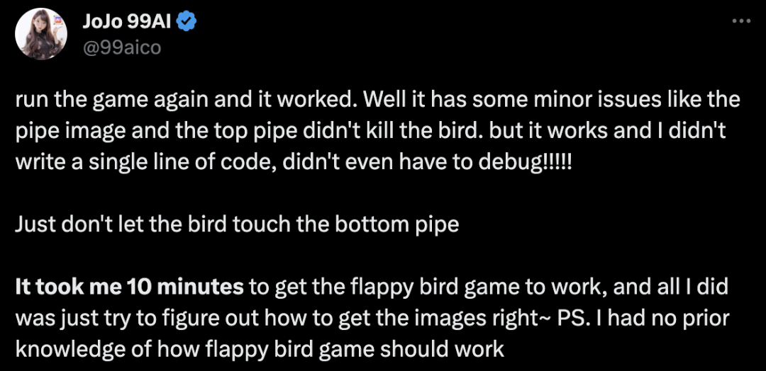 网友表示,虽然有一些小问题,比如顶部的管道没有杀死小鸟。但它还是成功了,而且我没有写一行代码,甚至都不用调试!!!!!