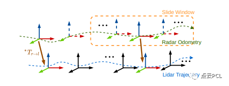 (2) 雷达在激光雷达上的定位:找到与雷达关键帧相似的激光雷达帧,并计算两者的外部参数,以获取当前位置与实际位置之间的偏差。