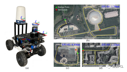 图6:(a)我们的测试车辆,配备了雷达、LiDAR、IMU和RTK传感器。(b)(c)(d)我们数据集中包含的三条路径,收集于浙江大学紫金港校区。