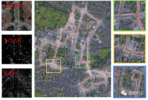 图1:使用RoLM生成的雷达里程计,其中彩色框显示了一些细节。图的左侧显示了同一场景中激光雷达数据和雷达数据之间的差异