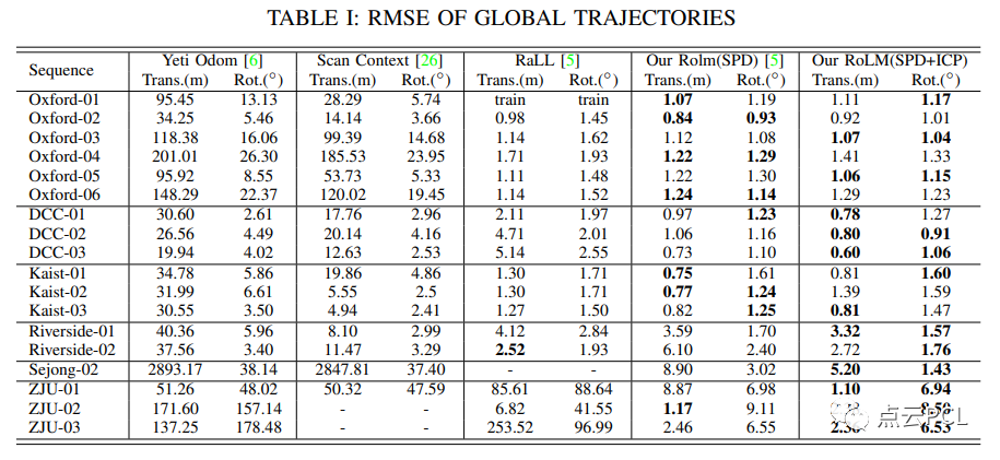 将提出的系统与两个公共数据集以及来自浙江大学的数据进行了比较。这些竞争性方法包括RO 、带有回环检测的RO 和Rall,还通过消融实验验证了所提出的描述符的有效性。结果在表I中呈现出来。我们使用开源工具进行误差计算,一些序列上轨迹估计结果的概述如图5所示。