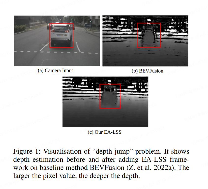 BEV 感知任务的核心问题之一在于如何在 2D 图像中重建丢失的深度信息,并为后续网络提供精确的BEV特征。Lift-Splat-Shot(LSS) 预测2D 特征图上每个像素的深度分布,并通过对应的深度估计将每个网格的 2D 特征“提升(lift)”到体素空间。然而,由于真实场景中部分区域间的深度差较大,这些“深度跳变”区域导致现有的深度网络(DepthNet)的预测值和实际深度有着显著差距,从而造成场景边缘的图像特征在体素中的位置偏移或丢失。如图1所示。