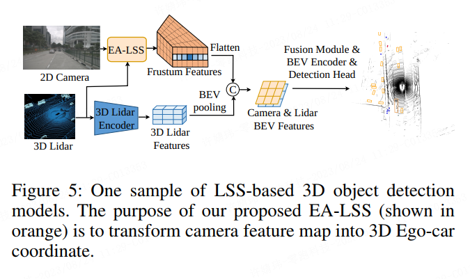 如图5所示,作为一种即插即用的视图转换范式,EA-LSS 可以在大部分基于 LSS 的 BEV 3D目标检测模型中使用。网络总的损失函数
