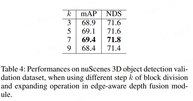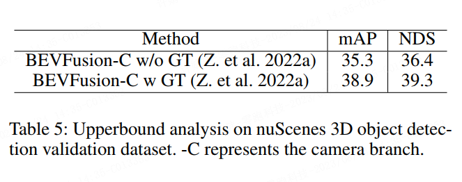 为了研究深度预测网络在“深度跳变”区域进行错误的预测带来的影响,我们引入了上限分析法。表 5 中我们使用 3D 激光雷达信息作为真值代替场景边缘预测的深度,图像分支的 mAP 和 NDS 分别提高了3.6% 和 2.9%。这个结果阐明了“深度跳变”问题的重要性。