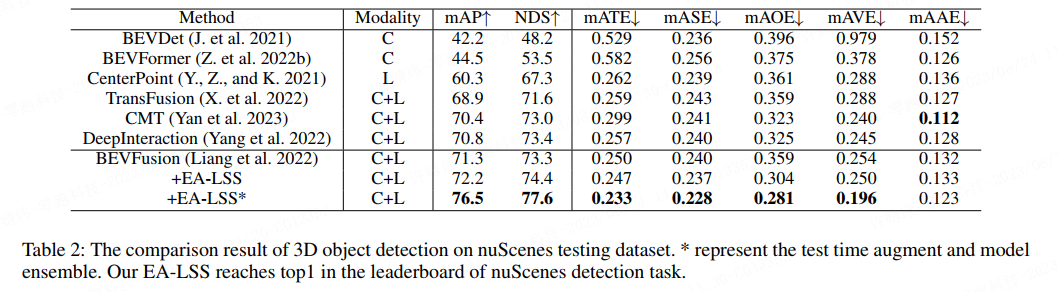 表 2 中,我们记录了在 nuScenens 3D 目标检测测试集上的实验结果对比。使用EA-LSS 框架后,mAP 和 NDS 相对于 BEVFusion 分别提高了 0.9% 和 1.1%。在增加了测试时间增强策略和模型集成策略之后,我们的 EA-LSS 方法的 mAP 和 NDS 分别达到了 76.5% 和 77.6%, 在 nuScenes 检测任务榜单上位列第一。