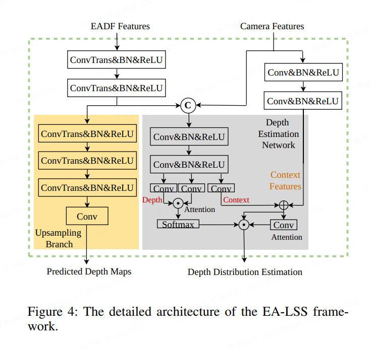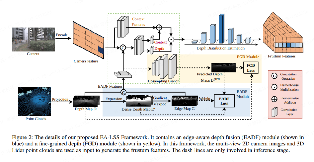 如图2所示,EA-LSS 由边缘感知深度融合模块(Edge-aware Depth Fusion Module, EADF)和精细化深度模块(Fine-grained Depth Module,FGD)耦合而成,可以预测细粒度全局深度分布并且关注深度跳变区域。下面将分别介绍 FGD 模块、EADF 模块以及整体的EA-LSS网络。