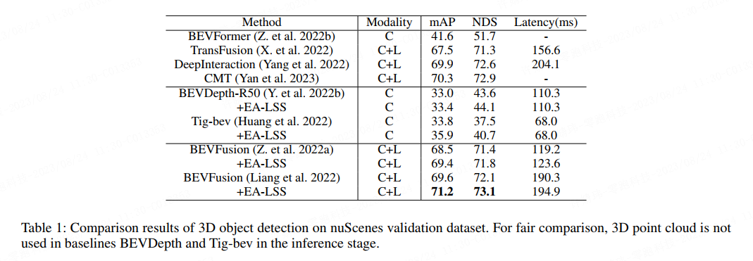 从表 1 所示为在 nuScenes 3D 目标检测验证集上的实验结果。从中可以看出,EA-LSS 在基于 LSS 的模型中均有较好的表现。插入EA-LSS后,camera-only 模型Tig-bev 的 mAP 和 NDS 分别提高了2.1% 和3.2%。与作为我们 baseline 的 BEVFusion 方法相比,mAP 和 NDS 分别提升了 1.6% 和 1.0%。